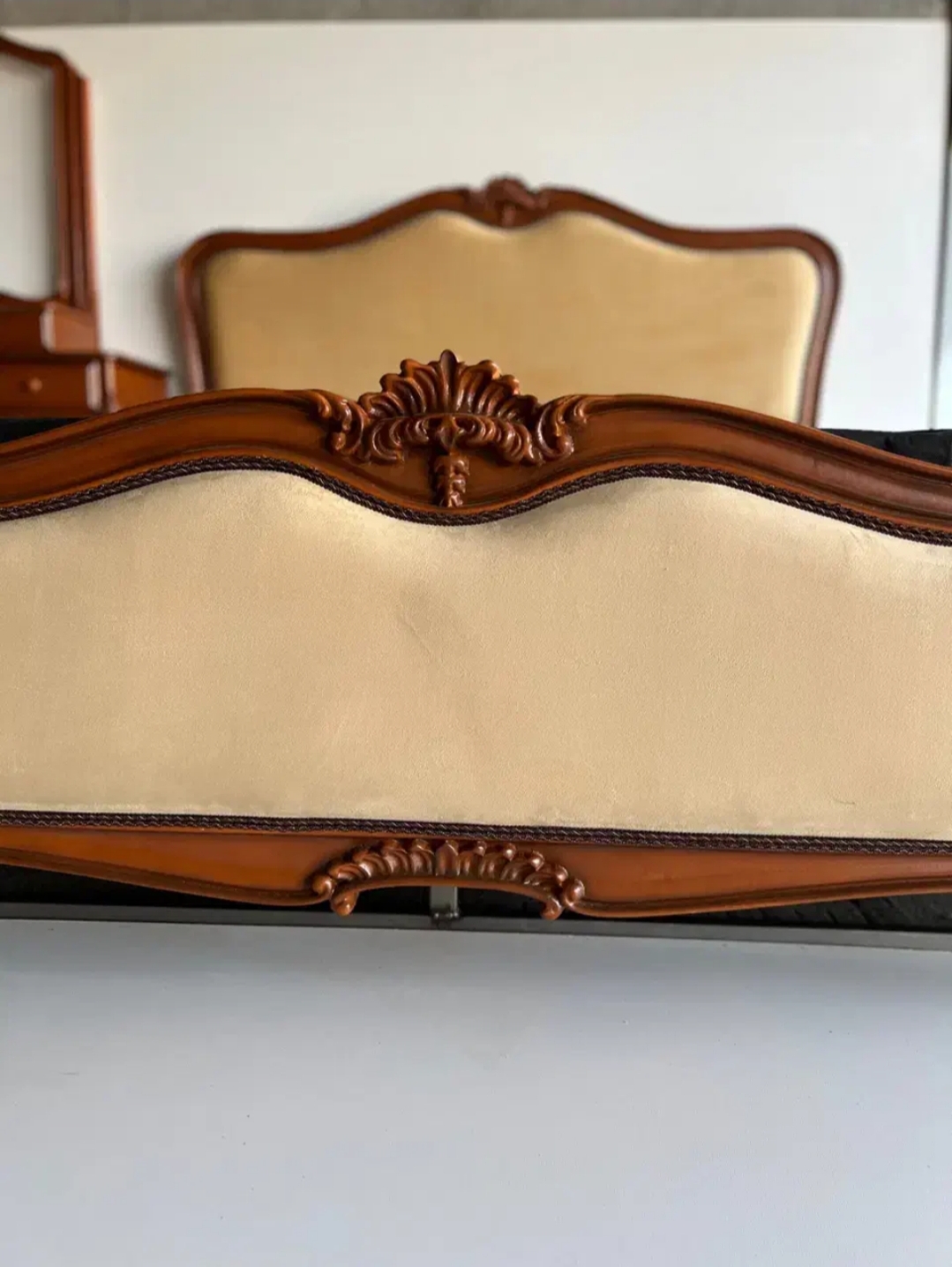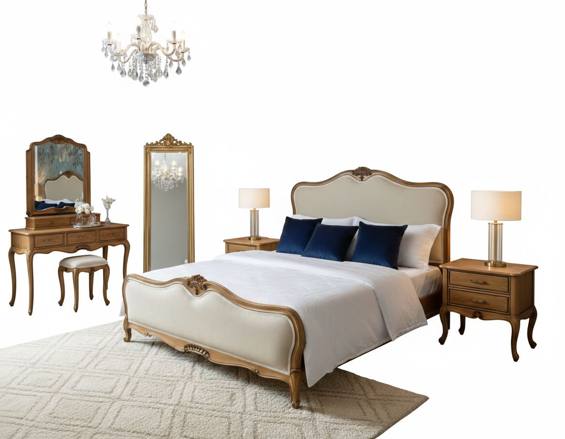 بدنه تمام چوب با رنگ گردویی گرم، در کنار تاج و پاتختیهای ظریف، این سرویس را به یک اثر هنری کاربردی تبدیل کرده است.