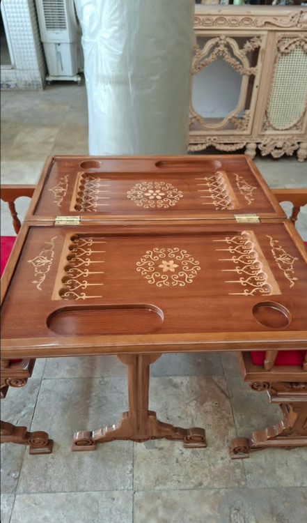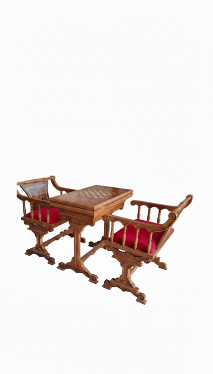 میز و صندلی چوبی منبت‌کاری‌شده دو منظوره | شطرنج و تخته نرد | چوب راش