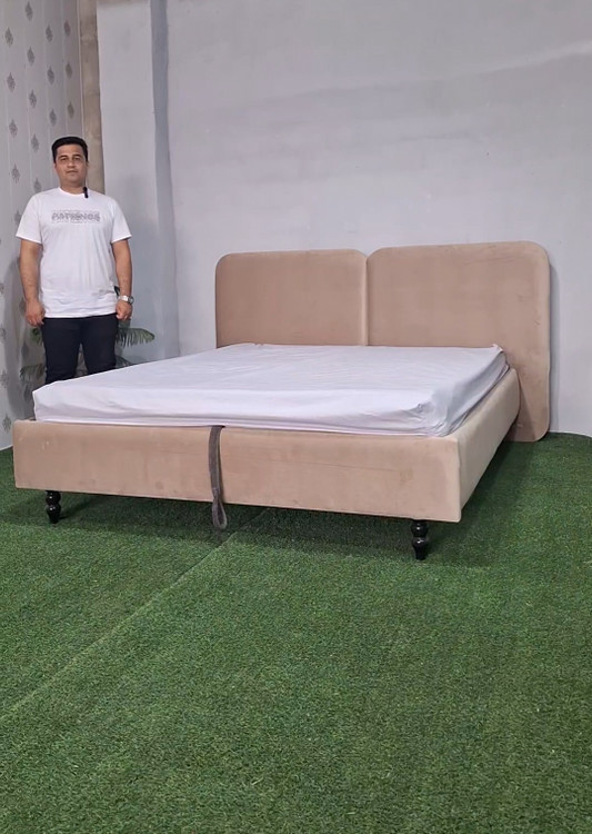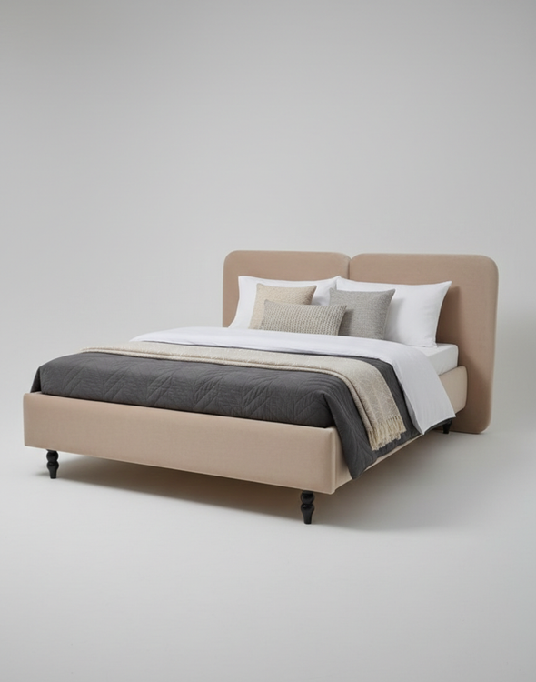 طراحی این تخت با خطوط نرم و گوشههای گرد، حس آرامش و امنیت را به فضا منتقل میکند. تاج تخت به صورت یکپارچه و کاملاً نرم کار شده که هم جلوهای خاص دارد و هم برای تکیه دادن هنگام مطالعه یا استراحت بسیار راحت است.