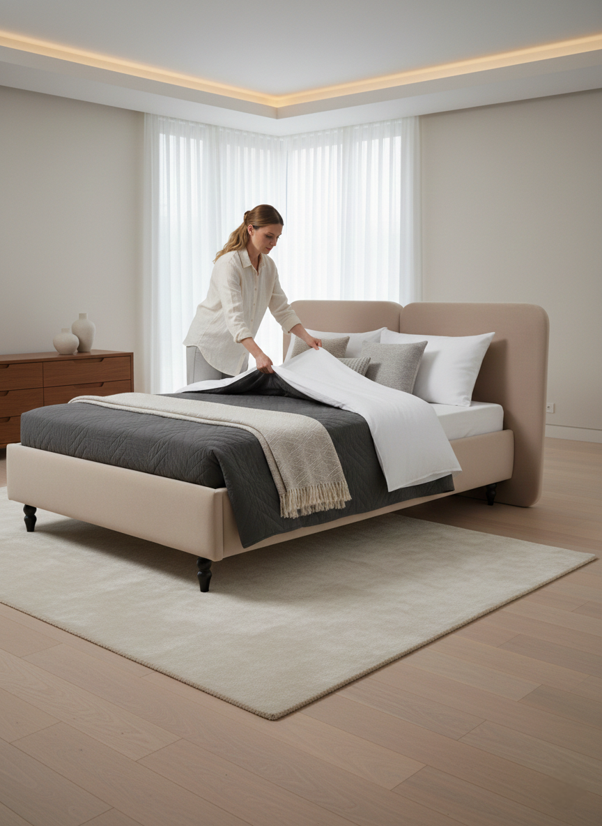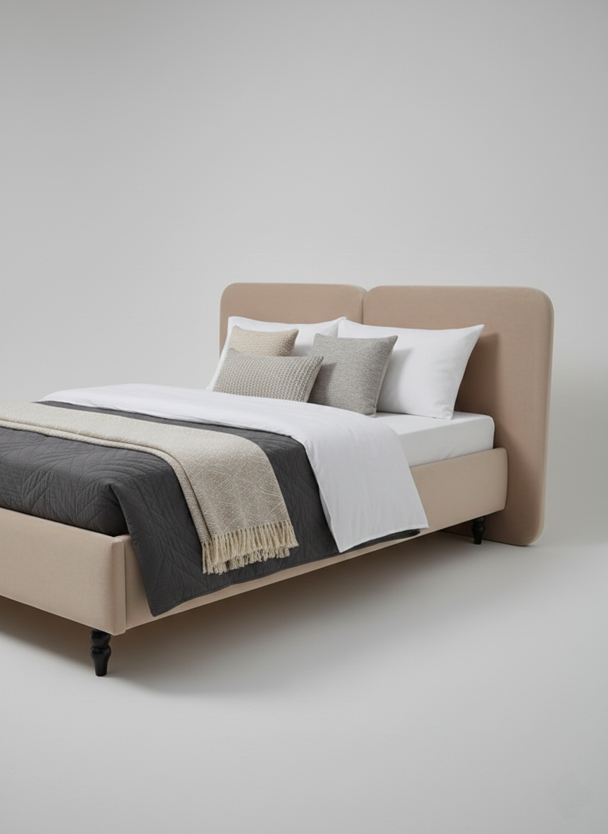 طراحی این تخت با خطوط نرم و گوشههای گرد، حس آرامش و امنیت را به فضا منتقل میکند. تاج تخت به صورت یکپارچه و کاملاً نرم کار شده که هم جلوهای خاص دارد و هم برای تکیه دادن هنگام مطالعه یا استراحت بسیار راحت است.